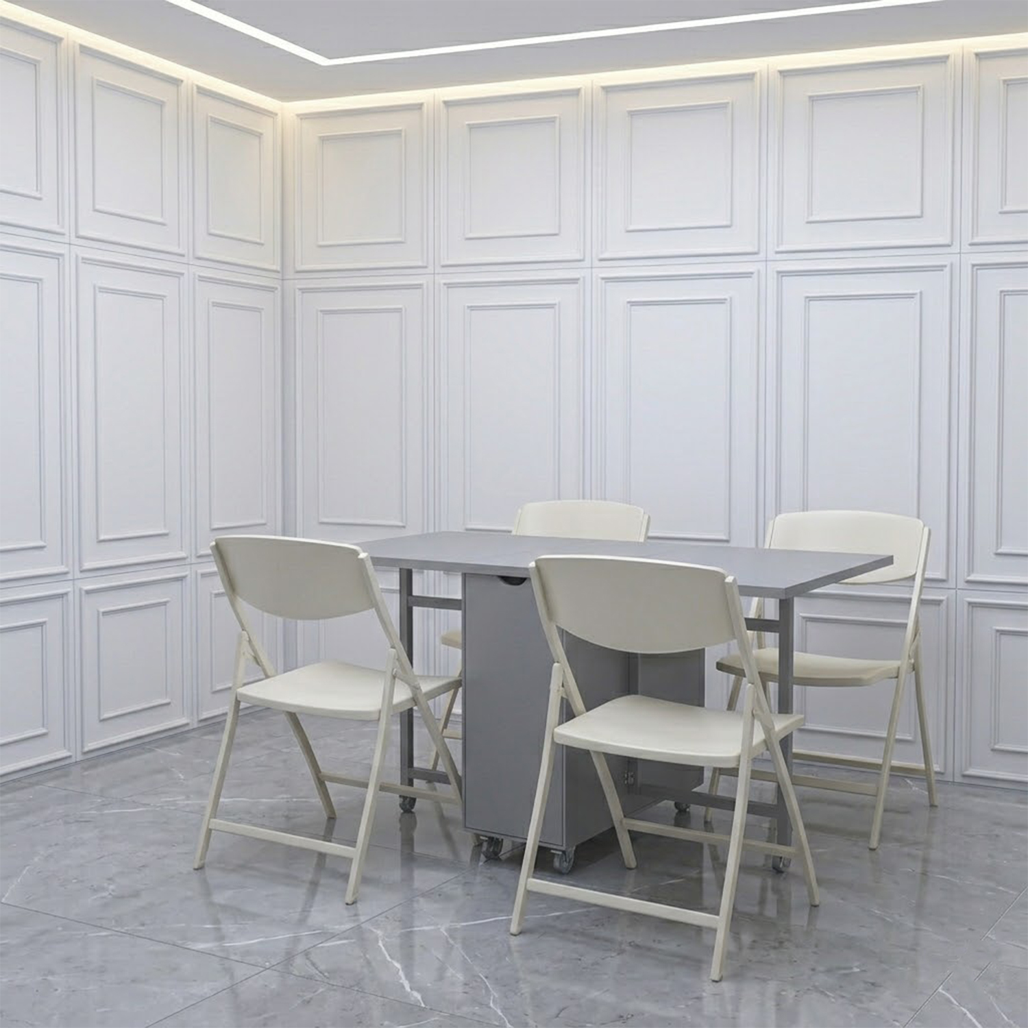 Compact. portable, multifunctional table that can be used as a four seater dining or a working table