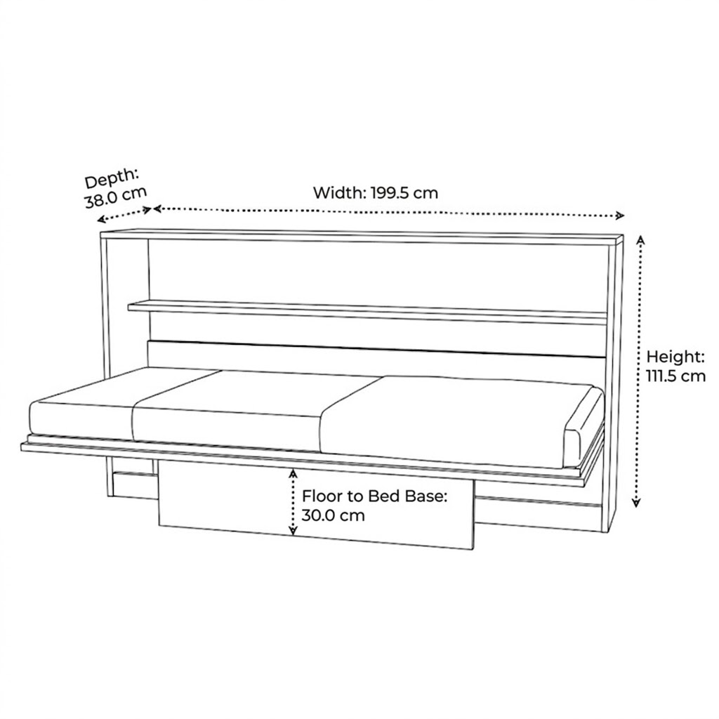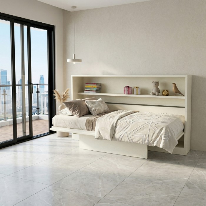 Our Standard Horizontal wallbed is a one frame product which is made with our patented Spring Balance Lift Mechanism (SBLM). A complete space saving solution. It comes with a leg flap, open the bed when required and fold-away when not in use and you have ample space to make a play area for your kids Storage placement may be another factor as overhead storage can be added above a horizontal wall bed to add more storage to your room. Our iconic wallbed also comes in horizontal position. The horizontal wallbed comes in a sleek body, with storage and overhead profile shutters and shelves for books and artefacts.