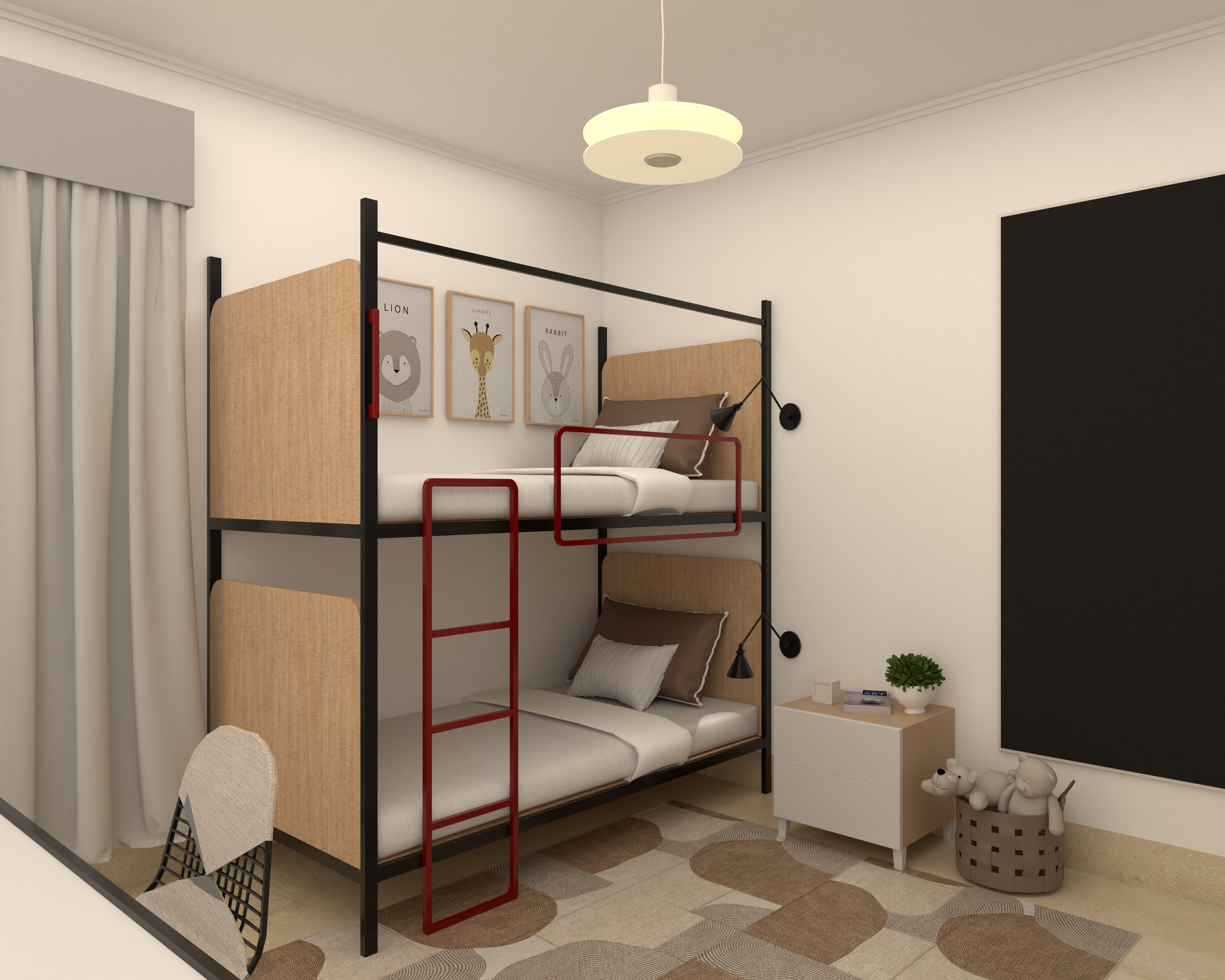 This modern bunk bed features a sleek black frame with wooden panels and a bold red ladder, offering both style and functionality. Perfect for kids' rooms, it maximizes space while adding a cozy and playful touch.