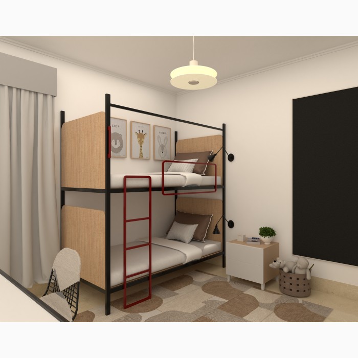 - Space-saving two-tier bunk design