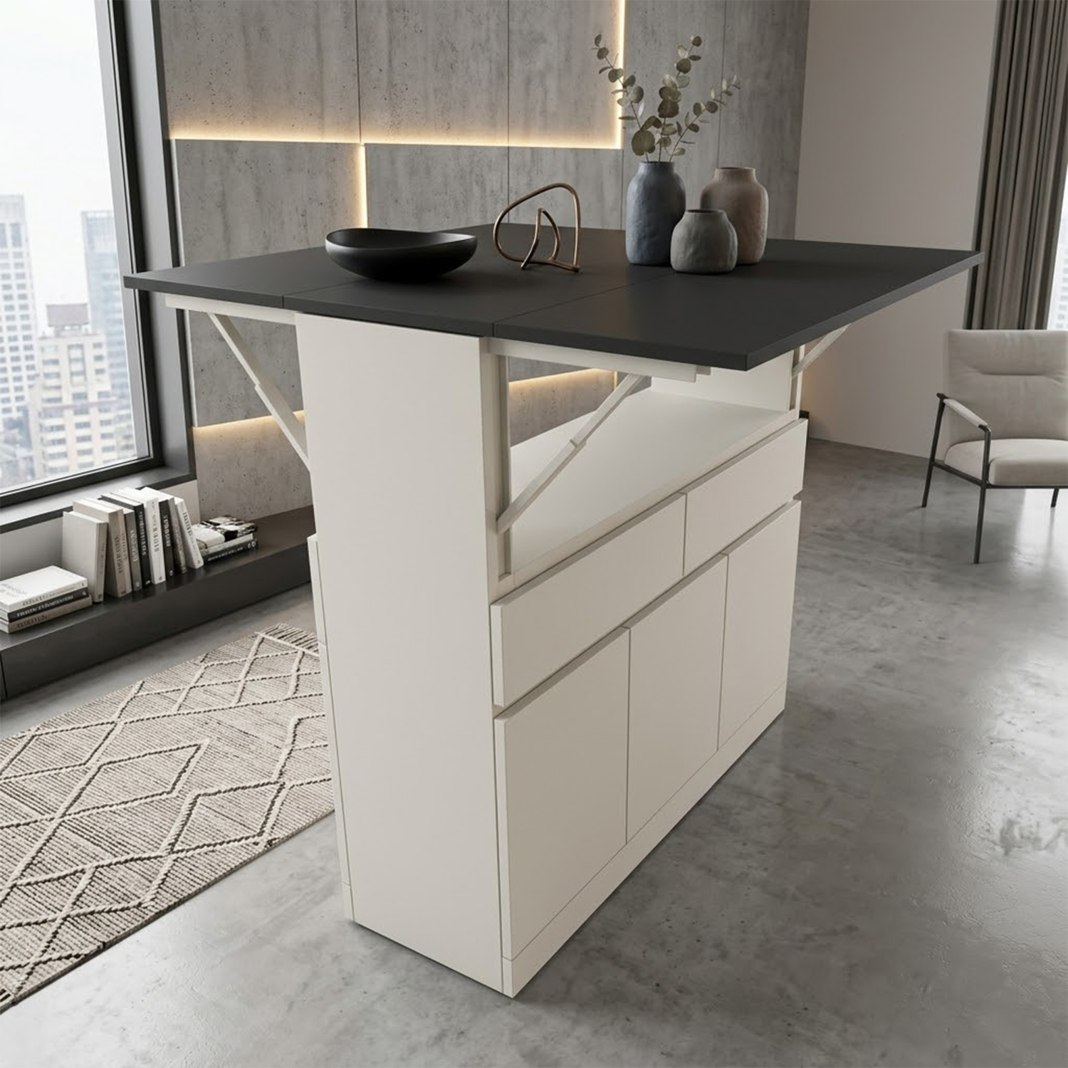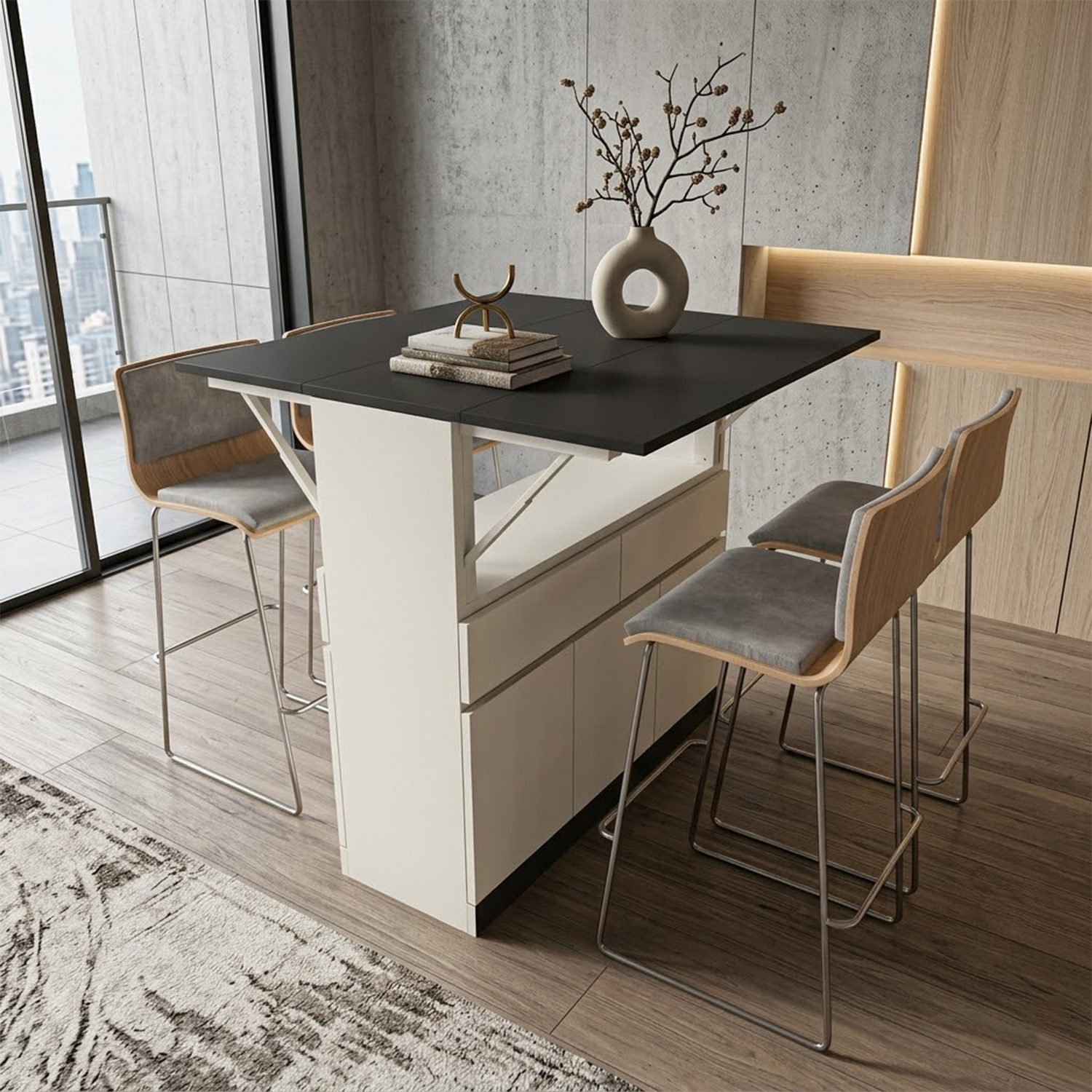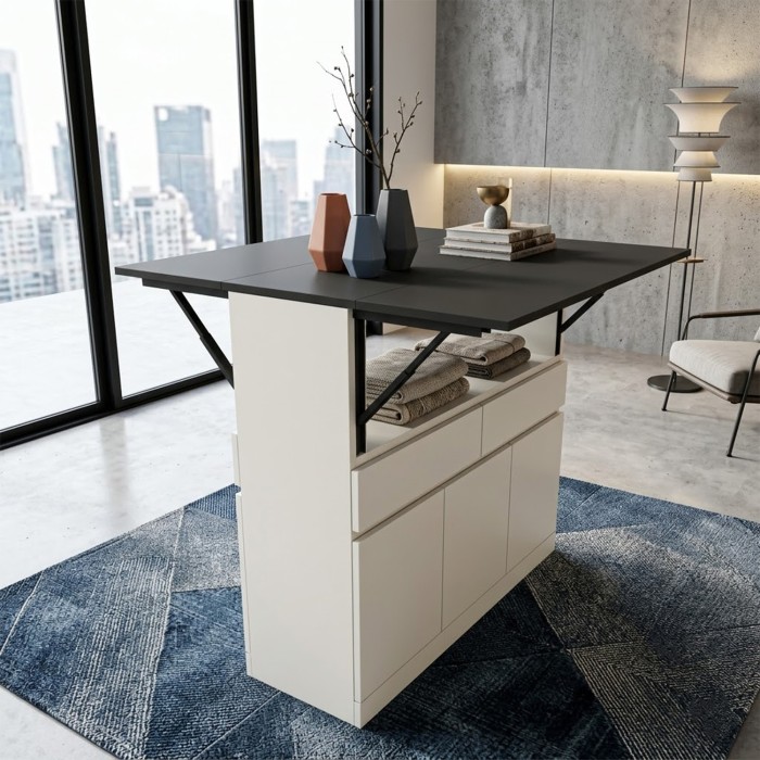 Equator is a versatile expandable multi utility table ideal for kitchen and dining areas. can be used as a large working top, breakfast counter or even as multipurpose table. it is portable (has 360o wheels)
