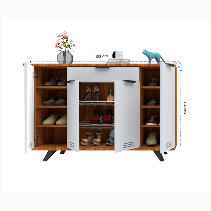 This modern shoe rack features a sleek white finish with wooden accents, offering a stylish yet functional storage solution. It includes multiple compartments with ventilation slots, ensuring proper airflow for shoes. The top surface can be used for decorative items, adding elegance to any space.