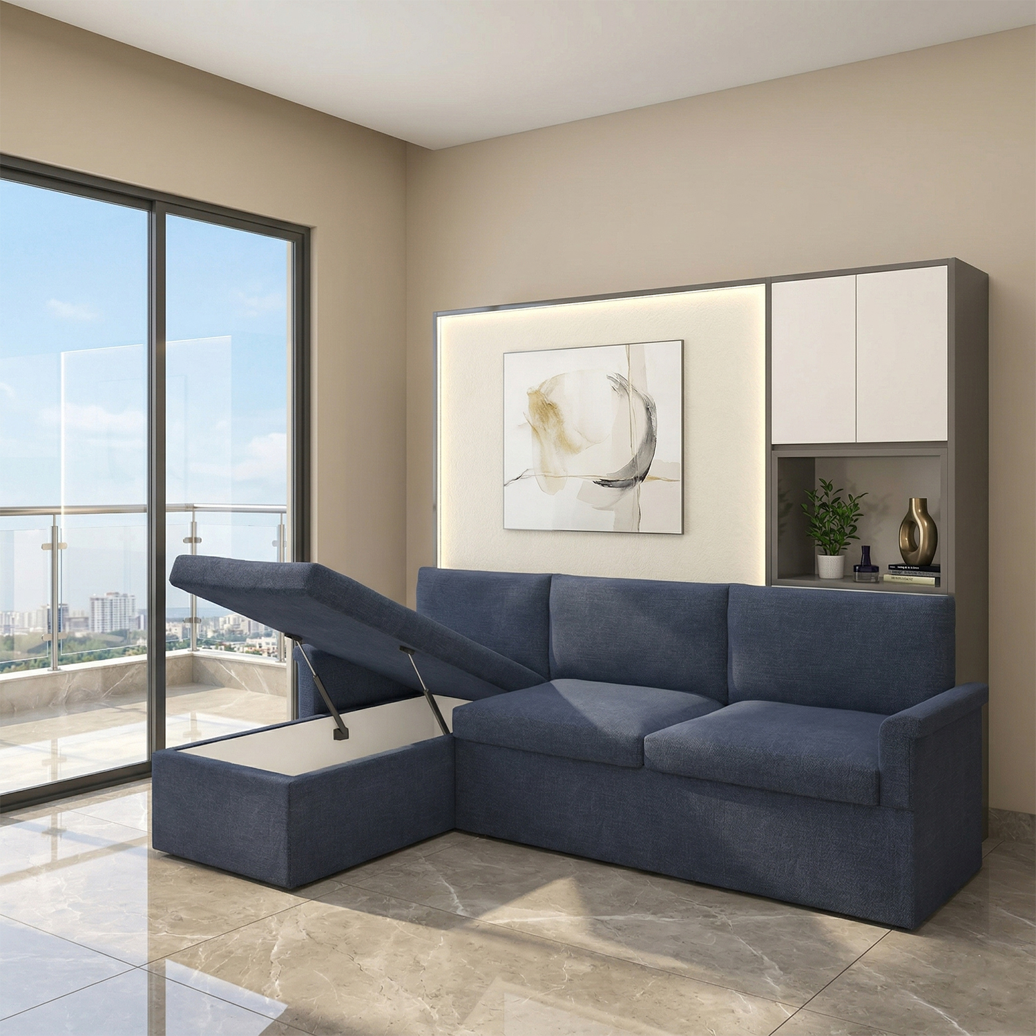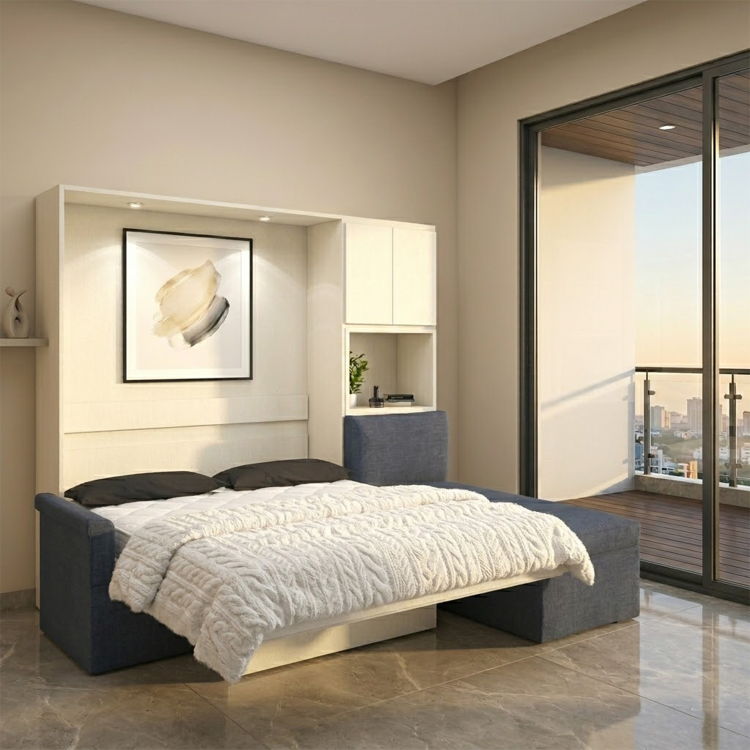 Our Standard wallbed is a one frame product which is made with our patented Spring Balance Lift Mechanism (SBLM). A complete space saving solution. It comes with a leg flap, open the bed when required and fold-away when not in use and you have ample space to make a play area for your kids Standard L shaped sofa & Tall storage unit.
