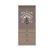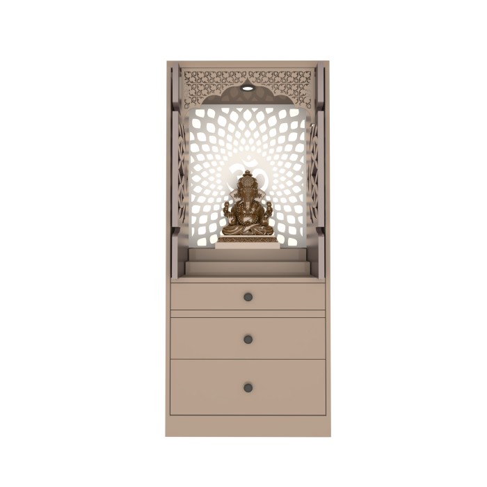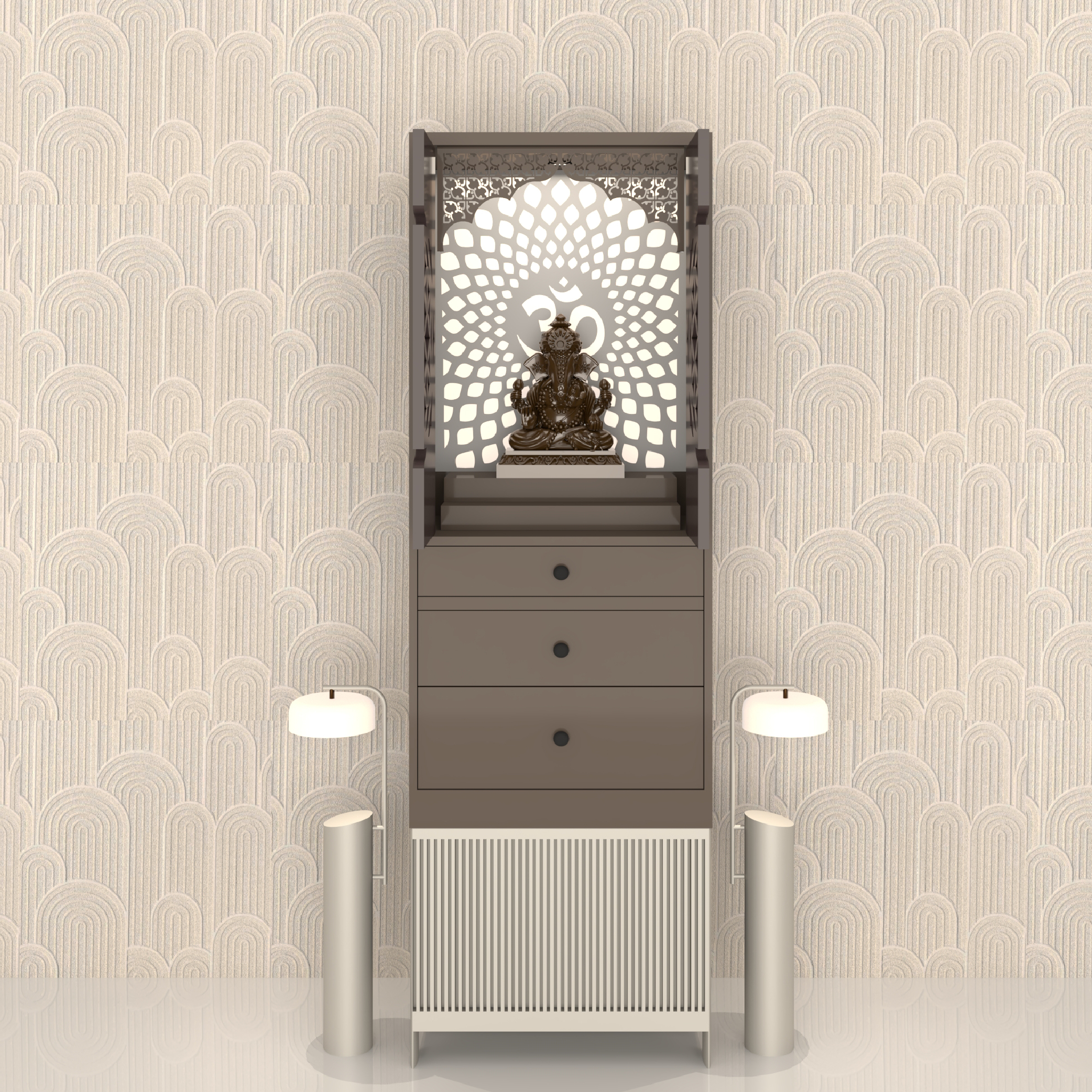 This elegant wooden temple features an intricate back panel with a radiant Om design, creating a divine focal point for spiritual spaces. Its sleek storage drawers and minimalistic style blend tradition with modern aesthetics.