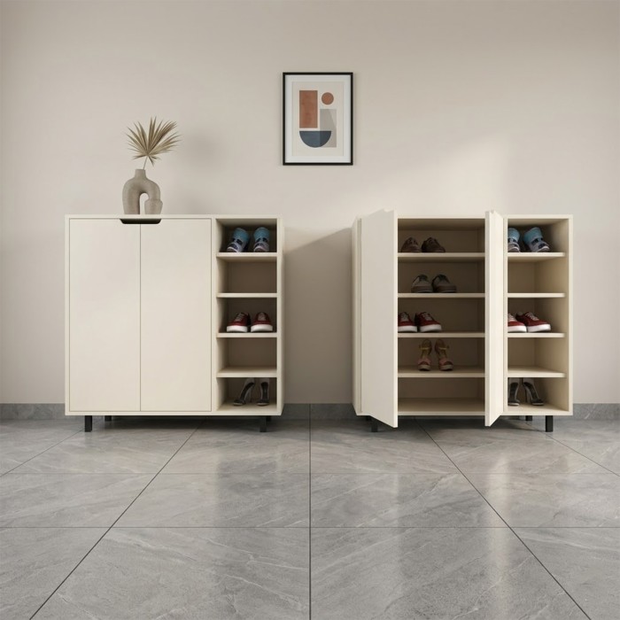 This modern shoe rack offers a combination of closed and open shelving, providing ample storage while keeping your footwear organized and easily accessible.