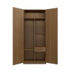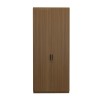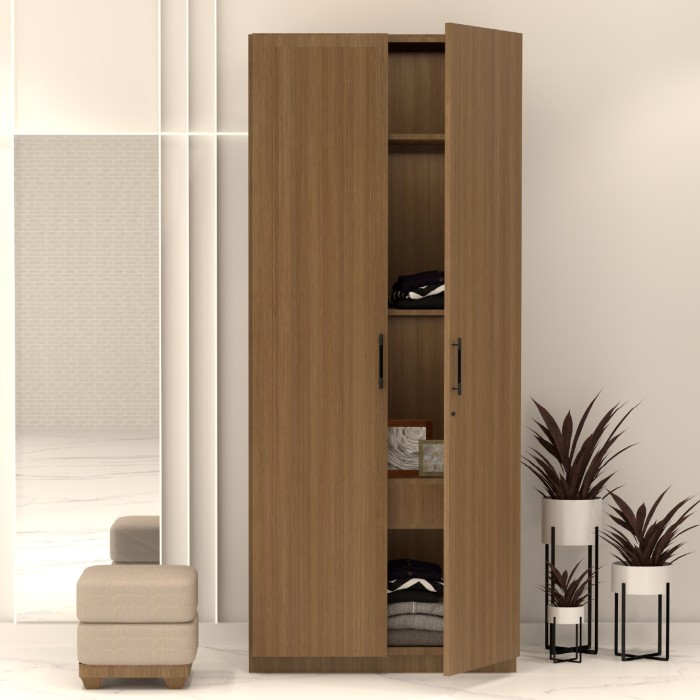 A sleek two-door wooden wardrobe designed for modern homes, offering ample storage with shelves and compartments. Its minimalist walnut finish adds elegance to any room décor.
