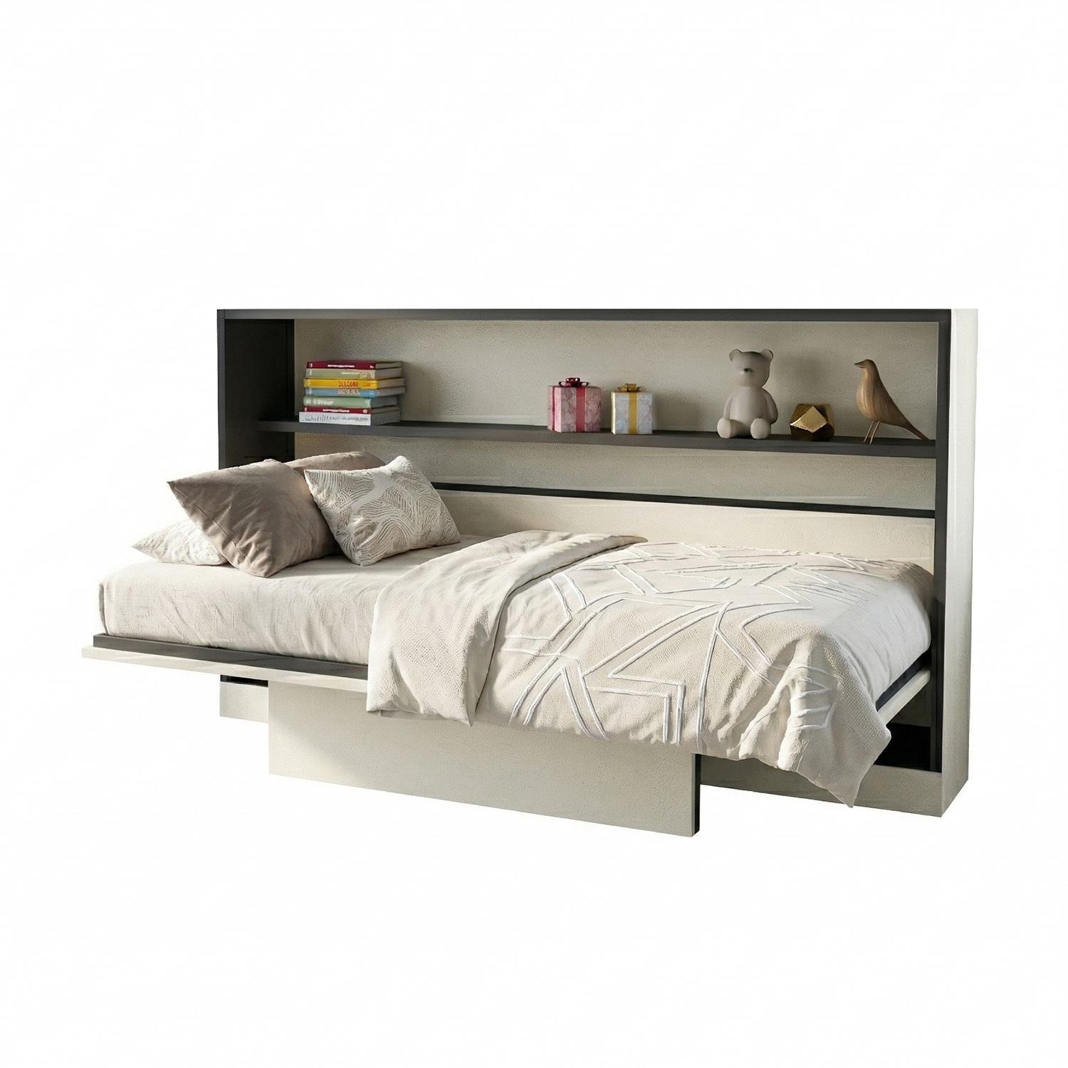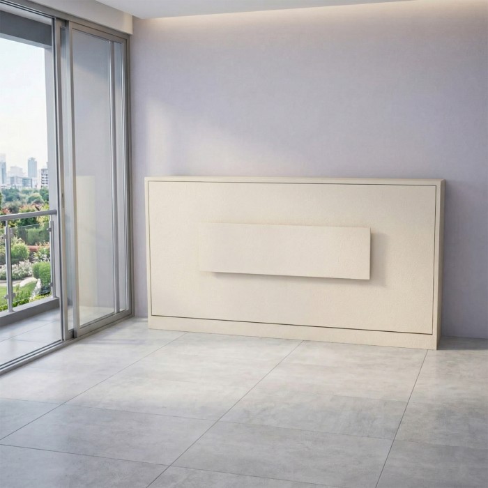 Our Standard Horizontal wallbed is a one frame product which is made with our patented Spring Balance Lift Mechanism (SBLM). A complete space saving solution. It comes with a leg flap, open the bed when required and fold-away when not in use and you have ample space to make a play area for your kids Storage placement may be another factor as overhead storage can be added above a horizontal wall bed to add more storage to your room. Our iconic wallbed also comes in horizontal position. The horizontal wallbed comes in a sleek body, with storage and overhead profile shutters and shelves for books and artefacts.