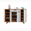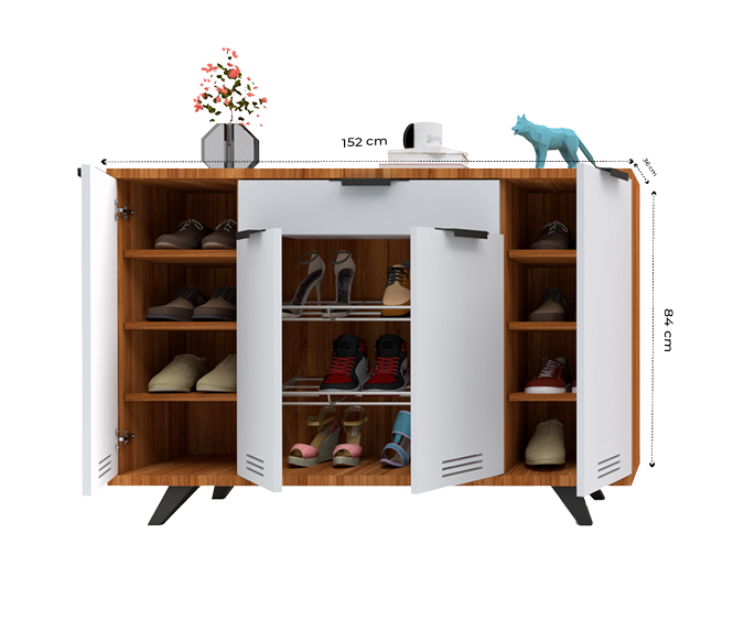 This modern shoe rack features a sleek white finish with wooden accents, offering a stylish yet functional storage solution. It includes multiple compartments with ventilation slots, ensuring proper airflow for shoes. The top surface can be used for decorative items, adding elegance to any space.