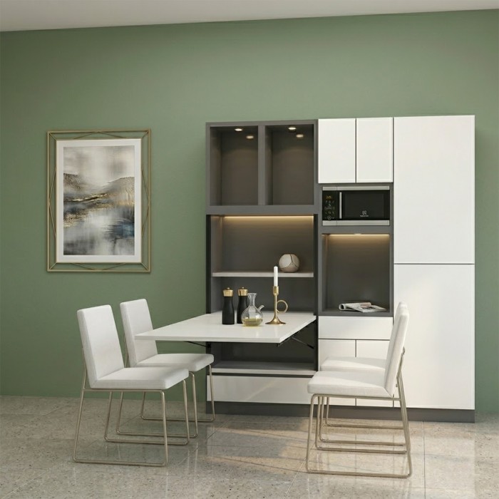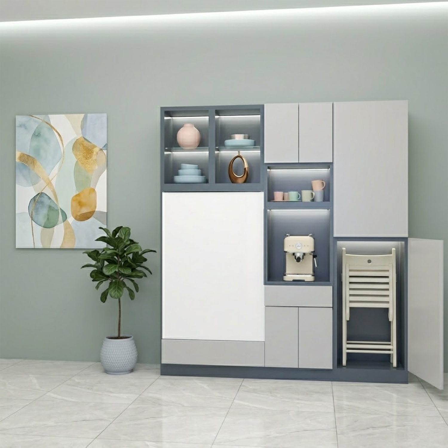 Enhance the look of your space with this compact dining table, that’s not just a space saver but also a compact and sleek crockery unit that expands to a full 4 seated dining table. Use it when required, the unit also has a pull-out for storage of other basic utilities. The pull-out is on the side so can be easily accessible when open too.