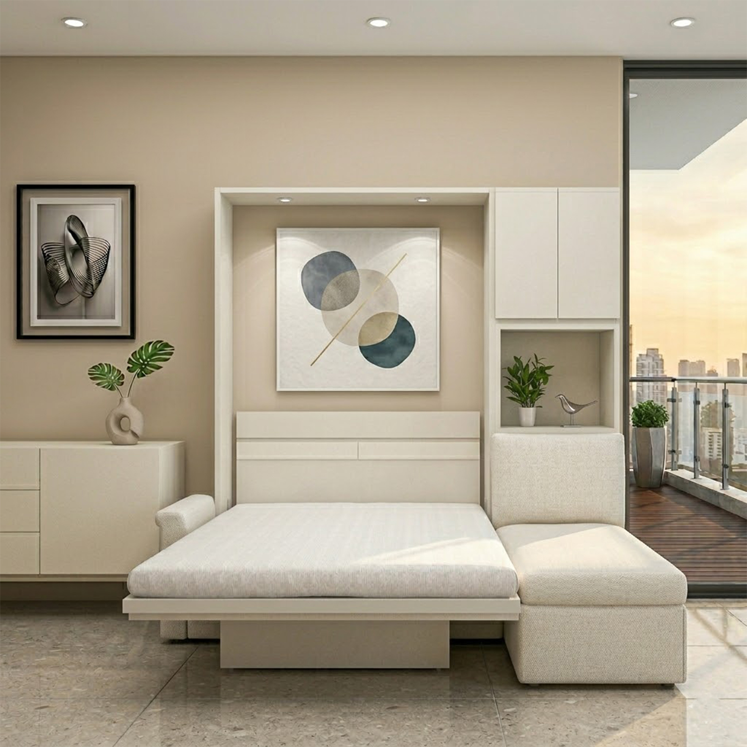 Our Standard wallbed is a one frame product which is made with our patented Spring Balance Lift Mechanism (SBLM). A complete space saving solution. It comes with a leg flap, open the bed when required and fold-away when not in use and you have ample space to make a play area for your kids Standard L shaped sofa & Tall storage unit.