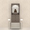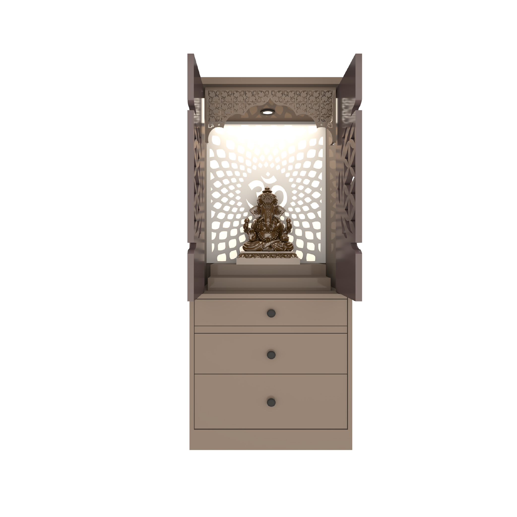 This elegant wooden temple features an intricate back panel with a radiant Om design, creating a divine focal point for spiritual spaces. Its sleek storage drawers and minimalistic style blend tradition with modern aesthetics.