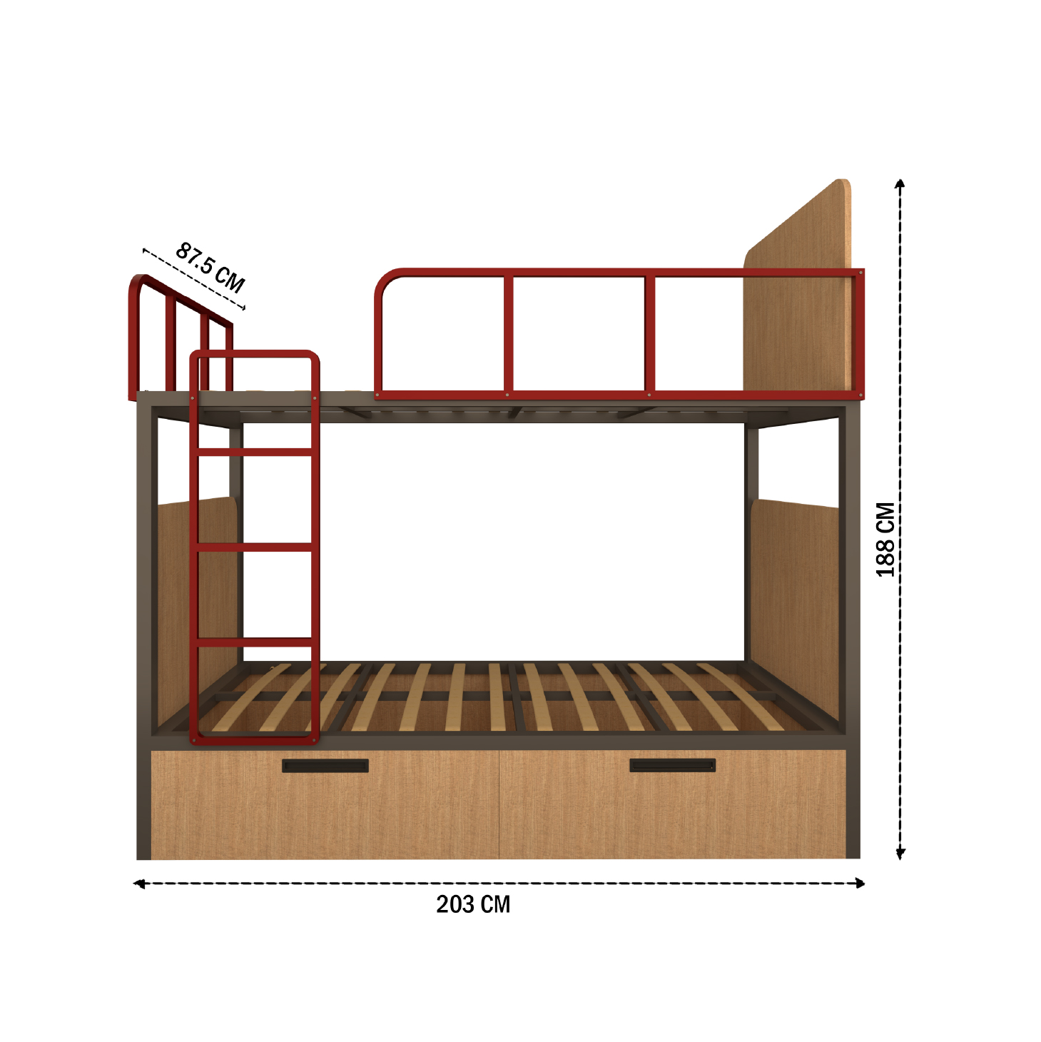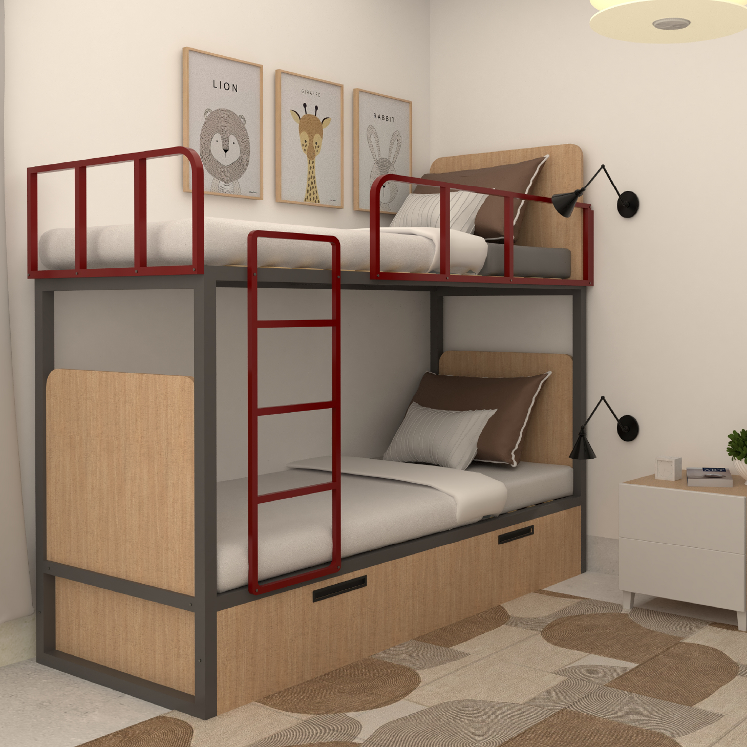 This stylish bunk bed combines functionality with a modern touch, perfect for kids or compact spaces. Crafted with a sturdy metal frame and warm wooden panels, it ensures durability and aesthetic appeal. Featuring built-in ladders and under-bed storage drawers, it maximises space and convenience in any room.