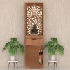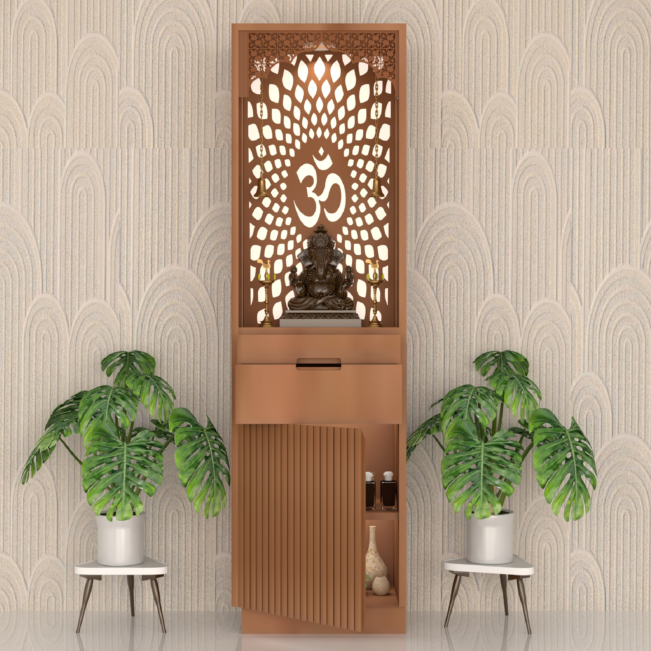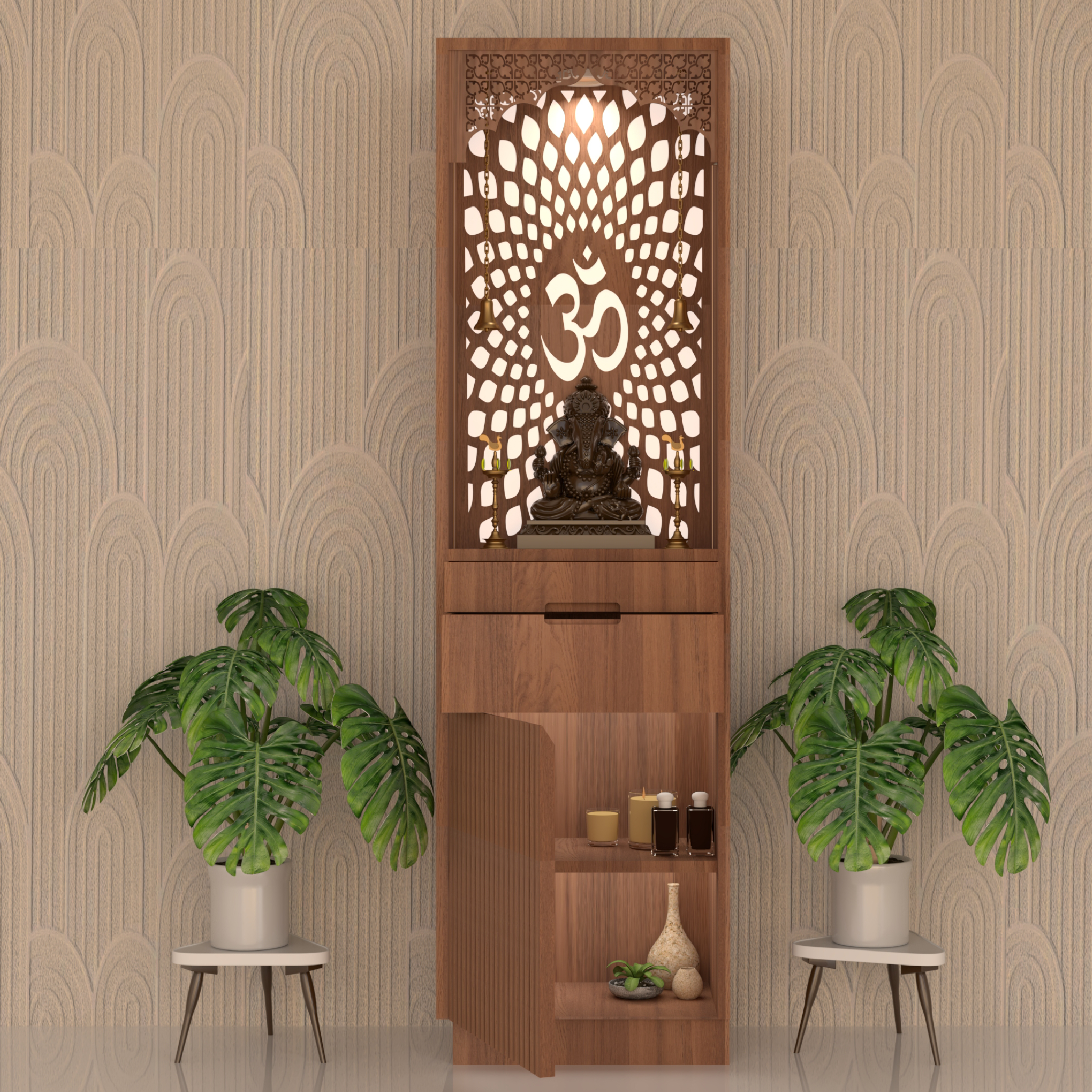 This elegant wooden temple features intricate laser-cut designs with a glowing "Om" symbol and a serene Ganesha idol. It combines traditional spirituality with modern aesthetics, perfect for any home.